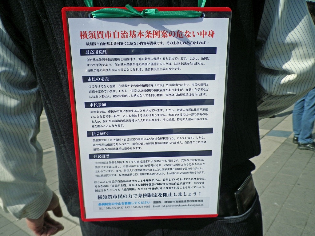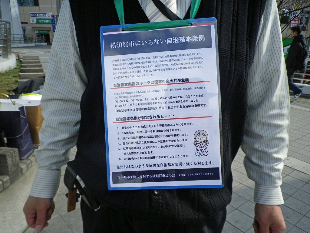 本日は横須賀中央駅前で行われた横須賀市自治基本条例阻止!絶対反対!街頭演説会の様子を撮影してまいりました自治基本条例の問題点は自治基本条例に反対する市民の会のHPにてご確認ください当日配布されたチラシですご覧ください街宣の様子