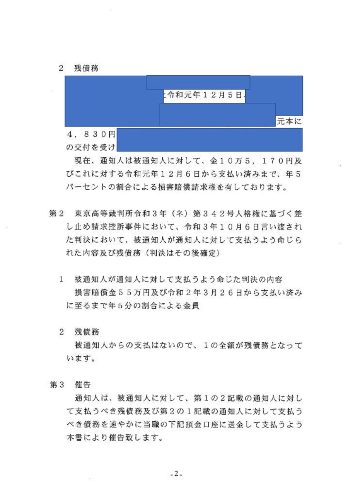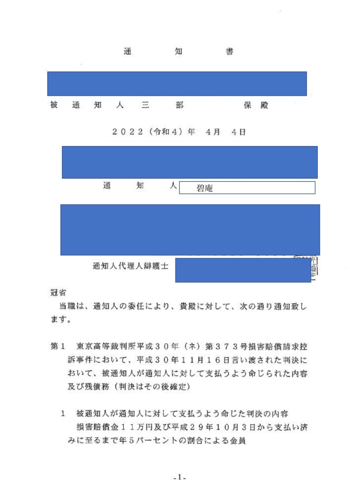 三部保氏に対し当方弁護士より 以下の通知書が[4/4発送 4/5 11:09到着(郵便追跡にて確認済み)]送付されましたが 指定期日までに返答がない為 ここに公開します三部氏にたいしては 判決の履行を求めてまいります